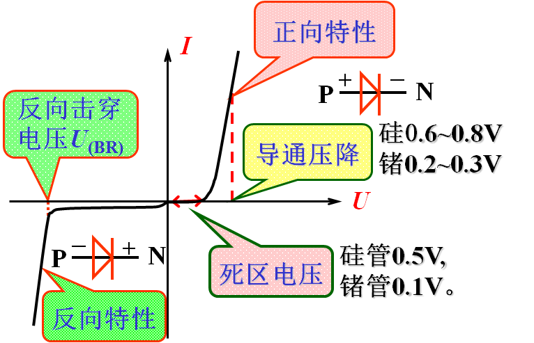 正向特性:加正向电压(称正偏),二极管导通,电流很快上升,正常工作时,硅管电压降约为0.7V,锗管电压降约为0.3V,呈现正向电阻很小。