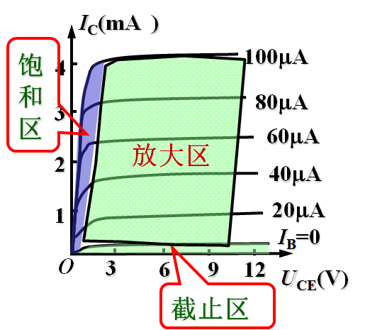 IB小于等于0,为截止状态;IB大于等于IBS,为饱和状态;IB在零和IBS之间,为放大状态。
