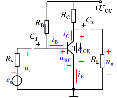 下图所示的电路中,在输入电压ui的作用下,基极电流iB=IB+ib,集电极电流iC=IC+ic,集电极、发射极电压uCE=UCE+uce。其中IB、IC、UCE是在输入电压ui=0时的电压和电流值,称为直流分量,也叫静态值,它是在直流电源VCC作用下产生的。ib、ic和uce是在输入电压ui不为零时,由于ui的作用,在直流分量上叠加的交流量,称为交流分量,也叫动态值。
