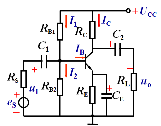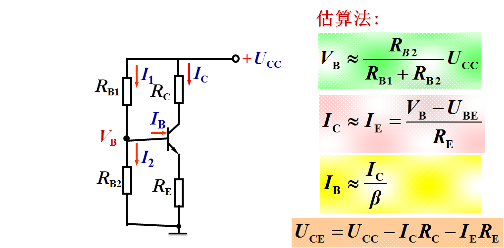 采用分压式偏置电路(含射极电阻RE),它可以有效的稳定静态工作点。射极电阻越大,稳定效果越好,但RE的存在会使放大倍数降低。与射极电阻并联旁路电容CE,可以消除射极电阻对放大倍数的影响。