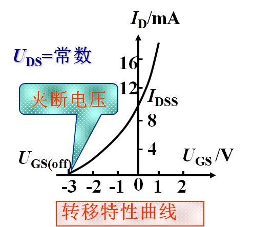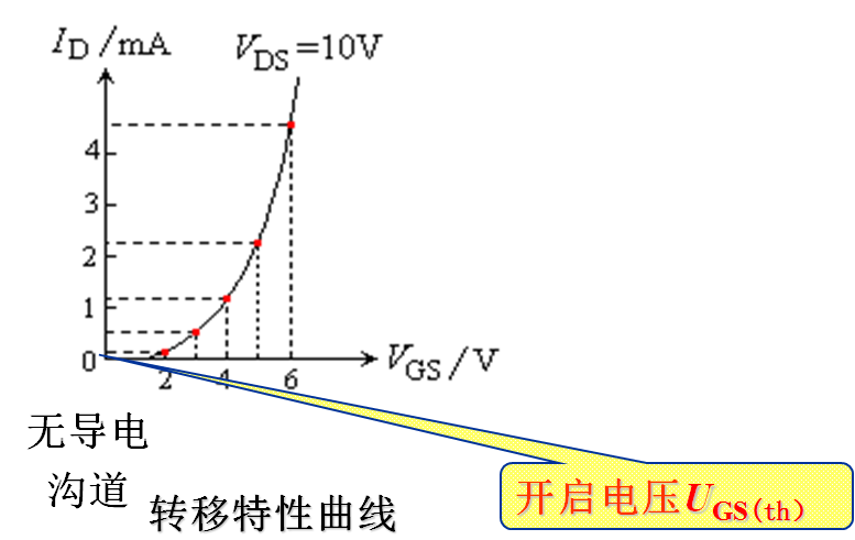 场效应管用栅极电压控制漏极电流,因而是电压控制元件,两者之间的关系用转移特性表示。增强型和耗尽型场效应管的转移特性如图所示: