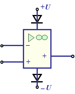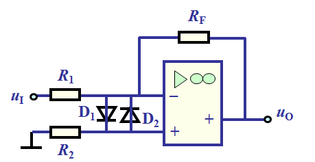 当输入端所加的差模和共模电压过高时会损坏输入级的晶体管。为此在输入端接入反向并联的二极管。如图所示: