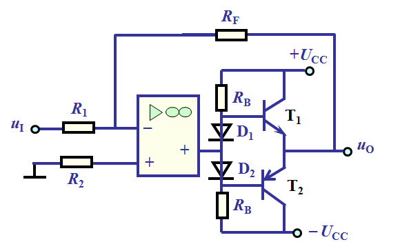 由于运算放大器的输出电流一般不大,如果负载需要的电流较大时,可在输出端加接一级互补对称电路,如图所示: