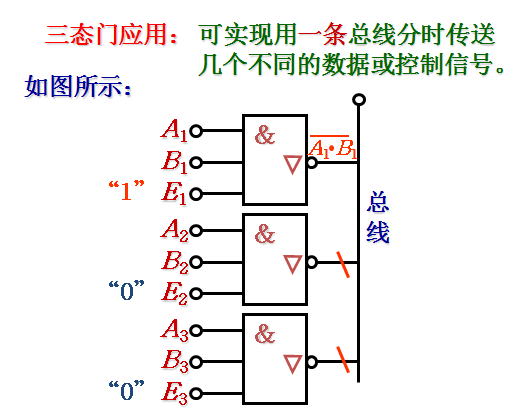 三态输出门电路的输出端具有三种状态,即高电平、低电平和高阻状态,E为控制输入端,当E有效时,输出、输入为与非关系,E端无效时,输出为高阻状态。