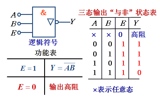 三态输出与非门电路逻辑式、真值表和符号如图所示: