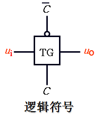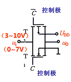 当C=0时,可见ui在0~10V连续变化时,两管子均截止,传输门关断,(相当于开关断开)ui不能传输到输出端。