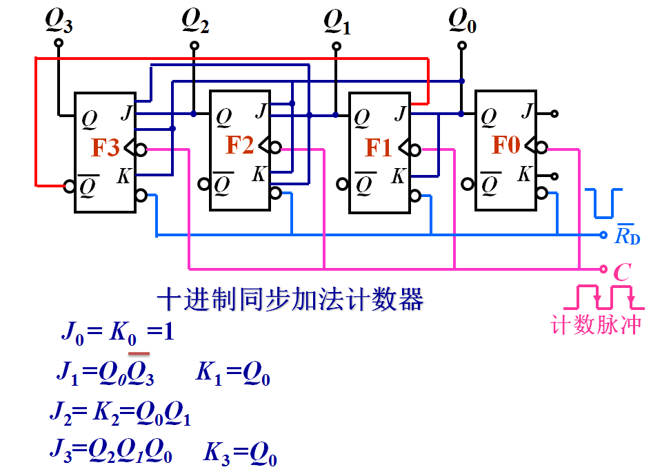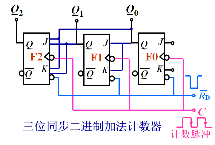 同步计数器计数脉冲同时接到各位触发器,各触发器状态的变换与计数脉冲同步。