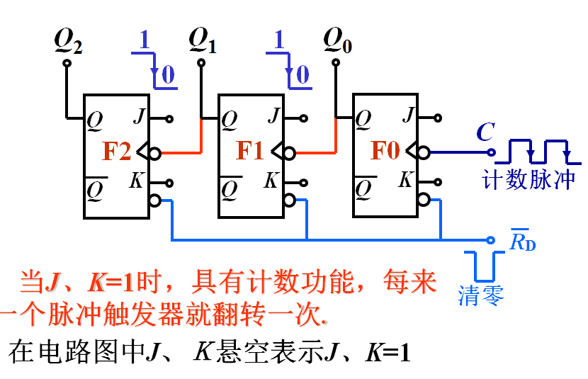 二进制计数器的位数等于触发器的个数,当触发器处于计数状态,如J-K触发器的输入端满足J=K=1,D触发器连接成T’触发器,在计数脉冲作用下便可进行计数,各个触发器的状态在计数脉冲作用下按照二进制数的规律变化。
