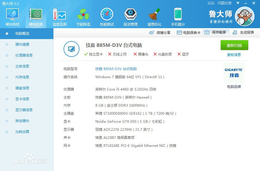 (3)鲁大师:一款集硬件检测和系统优化为一体的国产软件,不仅能够进行准确地进行硬件检测,实时地对关键部件进行监控和预警,而且还提供了相应硬件的驱动程序的下载、安装和更新功能,同时还能够下载和安装系统补丁,进行系统优化。目前鲁大师已成为奇虎360旗下的产品,更名为360硬件大师。