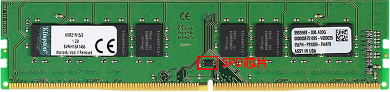 SPD芯片通常是一块容量为256B的EEPROM芯片,一般位于内存正面的中间位置,是一块4mm × 3mm的8引脚SOIC封装芯片。
