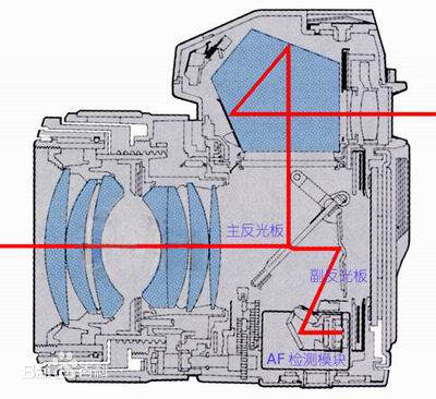 所谓“单镜头”是指摄影曝光光路和取景光路共用一个镜头,不像旁轴相机或者双反相机那样取景光路有独立镜头。“反光”是指相机内一块平面反光镜将两个光路分开:取景时反光镜落下,将镜头的光线反射到五棱镜,再到取景窗;拍摄时反光镜快速抬起,光线可以照射到胶片或感光元件CMOS或CCD上。