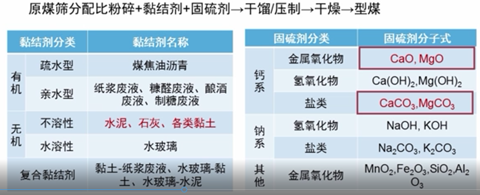 型煤固硫:将不同的原料煤经筛分后按制定的比例配煤,粉碎后同经过预处理的粘结剂和固硫剂混合,经干馏成型或直接压制成型或干燥,即得具有一定强度和形状的工业型煤。