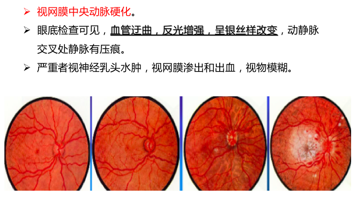 (4)视网膜:视网膜中央动脉亦常发生细动脉硬化。眼底血管是人体内唯一能被窥视的小动脉。高血压眼底改变包括血管和视网膜病变,按Keith-Wagener氏分类法分为四级,即Ⅰ级为视网膜小动脉轻度狭窄和硬化,动脉变细、Ⅱ级为小动脉中度硬化和狭窄,动静脉交叉压迫现象,动脉反光增强呈银丝状、Ⅲ级为视网膜水肿、渗出和出血和Ⅳ级为视乳头水肿。因视乳头水肿,视网膜渗出和出血,患者视物模糊。