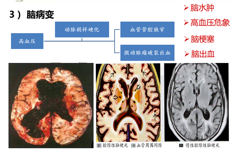 (3)脑:高血压时,由于脑的细小动脉痉挛和硬化,患者可出现一系列脑部变化。脑水肿:由于脑内细小动脉痉挛,硬化,缺血,引起毛细血管通透性增加,发生脑水肿,可出现头痛、头晕、眼花等。高血压脑病(hypertensive encephalopathy):由于脑细、小血管病变及痉挛致血压骤升,毛细血管通透性升高,引起急性脑水肿和颅内高压,导致以中枢神经功能障碍为主要表现的症候群称高血压脑病。其临床表现为血压显著升高,剧烈头痛、呕吐、抽搐,甚至昏迷。脑软化(softening of the brain):由于脑的细、小动脉硬化、痉挛,导致其供血区域脑组织缺血性梗死,形成质地疏松的直径<1.5 cm的筛网状病灶,称之为脑软化(cerebral softening)。脑软化灶数量多且较小,称微梗死灶(microinfarct),亦称脑腔隙状梗死(cerebral lacunar infarct)。最终坏死组织被吸收,由周围胶质细胞产生胶质,形成胶质瘢痕。常发生于壳核、丘脑、桥脑和小脑。由于脑软化较小,一般不引起严重后果。脑出血(cerebral hemorrhage):俗称中风(stroke),是高血压最严重且常导致死亡的并发症。多为大出血,常发生在基底节、内囊,其次为大脑白质、桥脑和小脑,约15%发生于脑干。出血区域脑组织完全被破坏,形成囊腔,其内充满坏死组织和凝血块。有时,出血范围甚大,可破裂入侧脑室。引起脑出血的原因为脑血管壁病变致使其弹性下降,当失去壁外组织支撑时(如微小软化灶),可形成微小动脉瘤(microaneurysm),如再遇到血压突然升高,可致微小动脉瘤破裂出血;脑血管的细、小动脉硬化使血管壁变脆,血压升高时可破裂出血;脑出血多见于基底节区域(尤以豆状核最常见),因为供应该区域的豆纹动脉从大脑中动脉呈直角分出,直接承受压力较高的血流冲击,易使已有病变的豆纹动脉破裂出血。