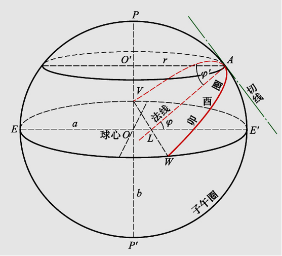 大地纬度φ(B):参考椭球面上某点的法线与赤道平面的夹角。北正南负。