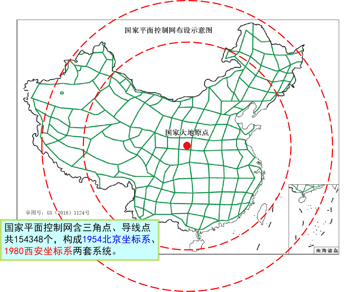 以大地原点为基础,在地面上选择一系列控制点,并建立起一系列三角形,组成三角锁和三角网。