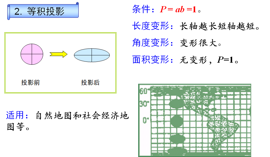 等积投影:投影面与椭球面上相应区域的面积相等。