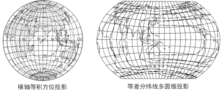 地图投影的实质是将地球椭球面上的经纬网按一定的数学法则转移到平面上。经纬线网是绘制地图的“基础”,是地图的主要数学要素。