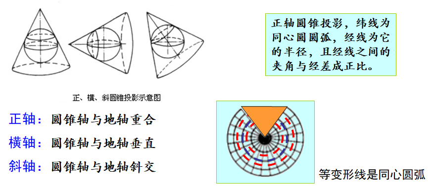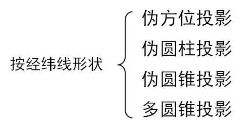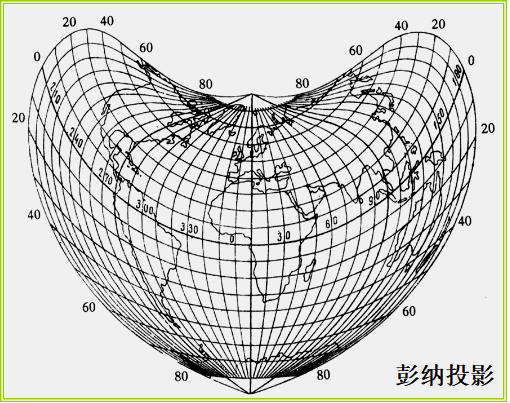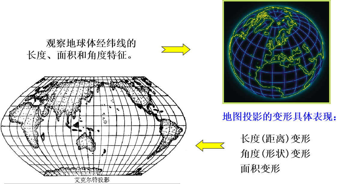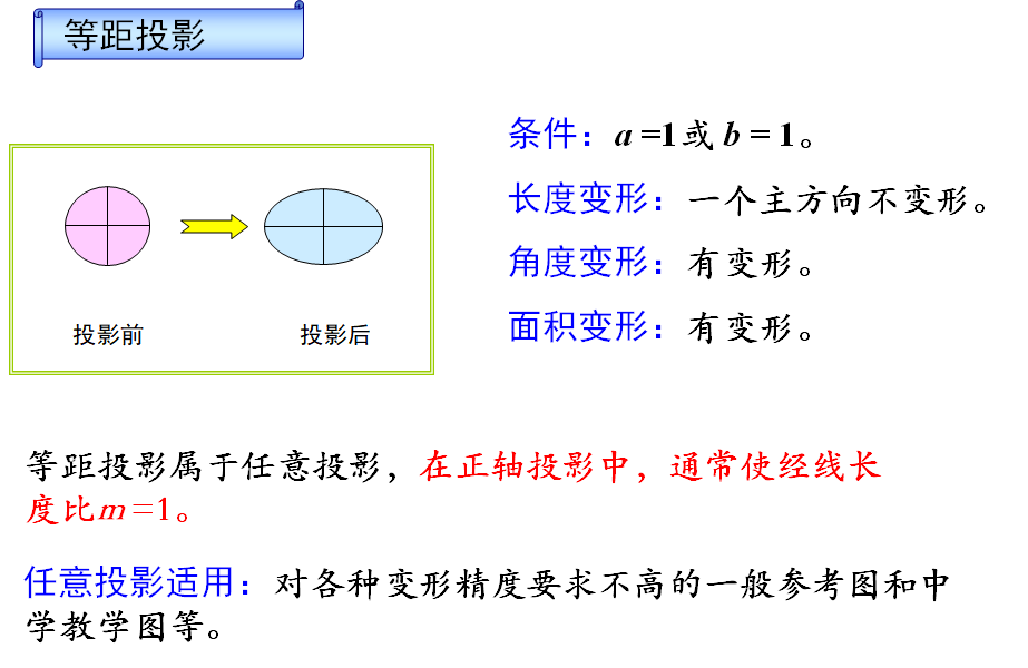 任意投影:投影图上,长度、面积和角度都有变形,既不等角又不等积。
