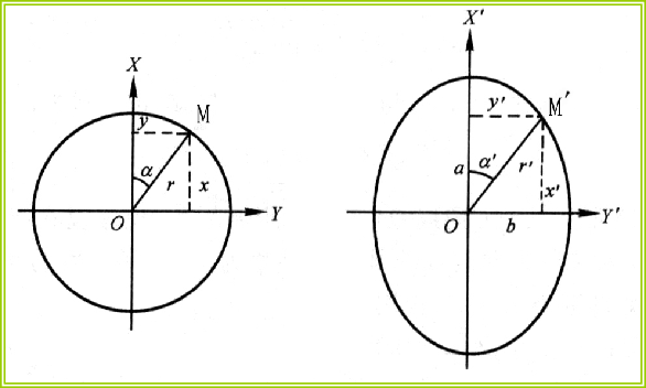 o’为o的投影,以主方向作为坐标轴,M’(x’, y’)是M(x, y)的投影,令主方向长度比为a和b,则: