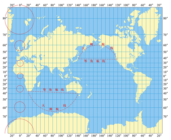 等角航线在墨卡托投影图上表现为直线,这一点对于航海航空具有重要意义。