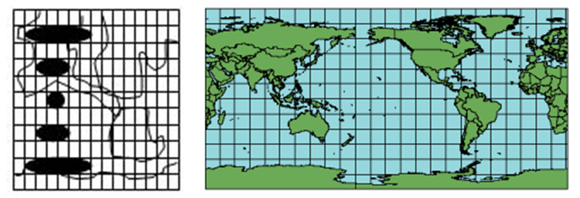 在上述三种投影方式中,最常用的是正轴圆柱投影,假定视点在球心,正轴圆柱投影中,经纬线网的特点是: