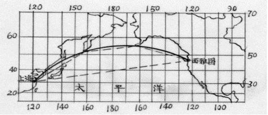 等角航线不是地球上两点间的最短距离,地球上两点间的最短距离,是通过两点的大圆弧(又称大圆航线或正航线)。大圆航线它各经线的夹角是不等的,因此它在墨卡托投影图上为曲线。