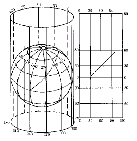 假定以圆柱面作为投影面,把地球球面上的经纬线网投影到圆柱面上,然后沿圆柱面的母线把圆柱切开展成平面,就得到圆柱投影。