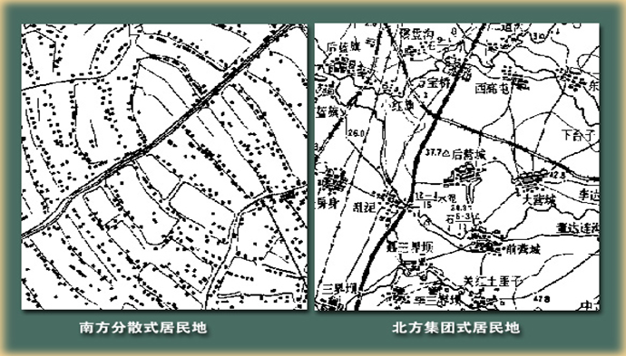 例如:南北方居民点分布差异;我国江南水网地区与西北干旱区的差异;山区和平原地区的地形差异。