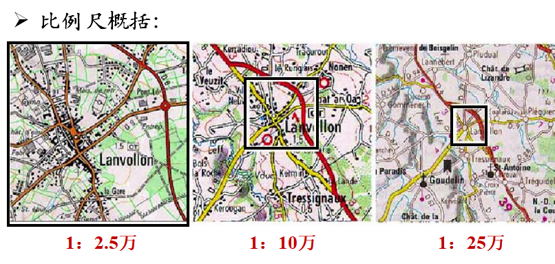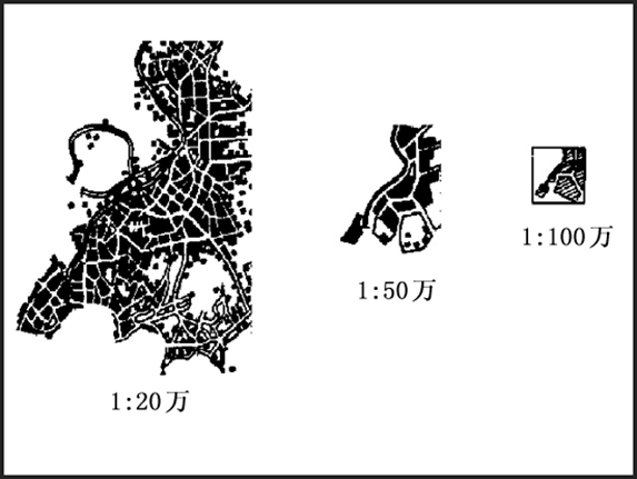 地图比例尺是决定地图概括数量特征的主要因素。限定了制图区域幅面和要素总量。同一地区不同比例尺地图上,其地物表示的详细程度存在明显差异。