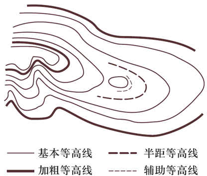 大比例尺地形图以等高线表示地势,一般表示基本等高线和加粗等高线(计曲线),以表示缓坡上地形起伏,在必要的地段增加半距等高线(间曲线)和1/4距等高线(辅助等高线也称助曲线)。