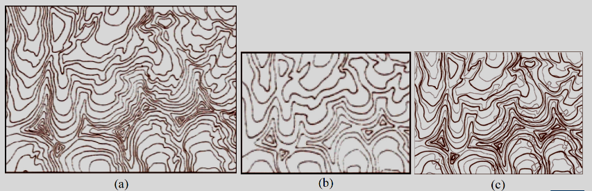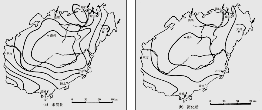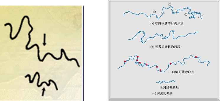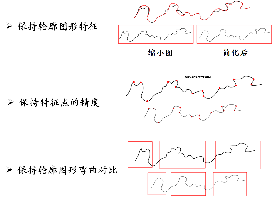 图形形状简化的基本要求是:(1)保持轮廓图形和弯曲形状的基本特征;(2)保持弯曲转折点的相对精确度;(3)保持不同地段弯曲程度的对比。