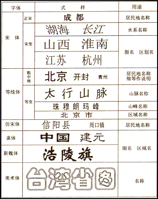 注记有字体、尺寸、色相等要素,地图注记便成为空间信息归类的手段。例如在普通地图上,通常黑色表示人文地物,蓝色表示水文地物,棕色表示地貌。