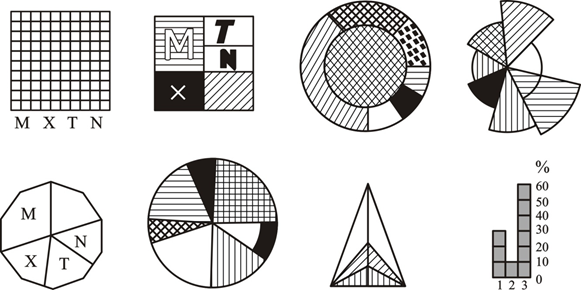 扇形或格状分割圆是常用的结构统计图,反映了事物总量及其内部组成。