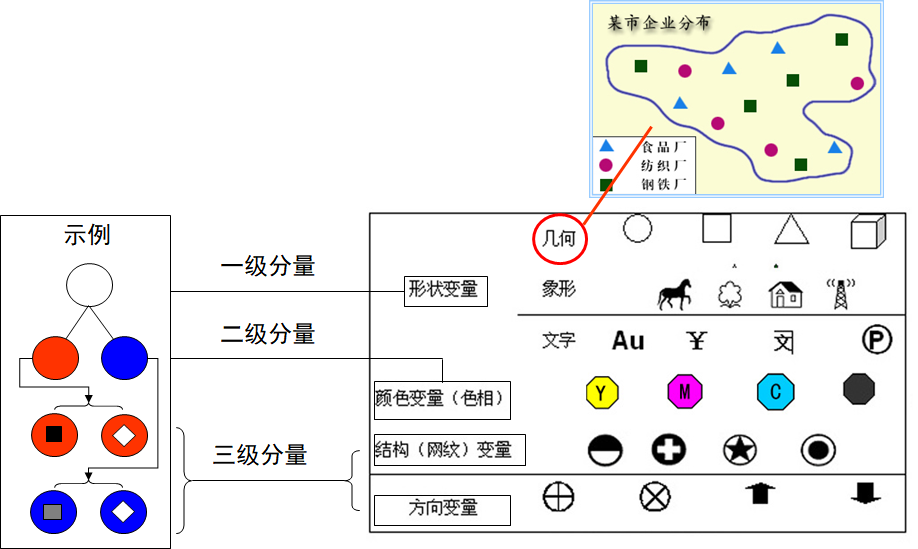 通过点状符号准确的图面定位和视觉变量组合,表达出其定性特征的空间分布差异,这种符号组合配置方式即定位符号法。