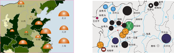定位符号法——点状符号通过准确的图面定位和符号视觉变量组合,表达地理数据的属性特征和空间分布差异,这种符号配置方式称为定位符号法。
