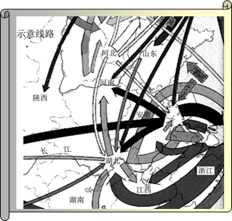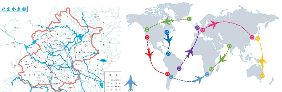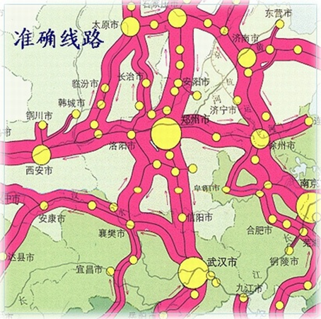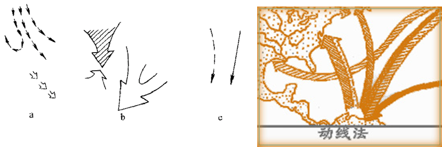 动线符号法——以线状符号的定位和指向表示事物移动的路径和方向,以形状和颜色表示质量特征,以符号宽度表示定量特征,这种符号的组合称为动线符号法。