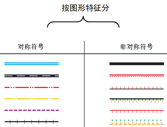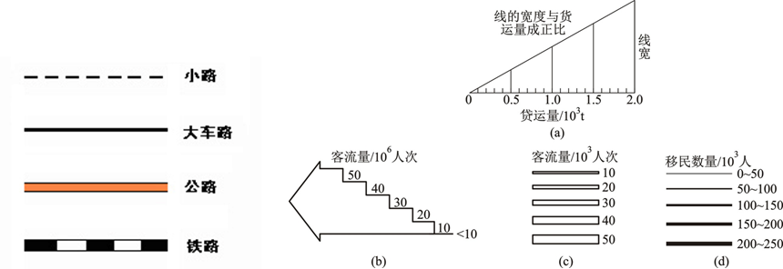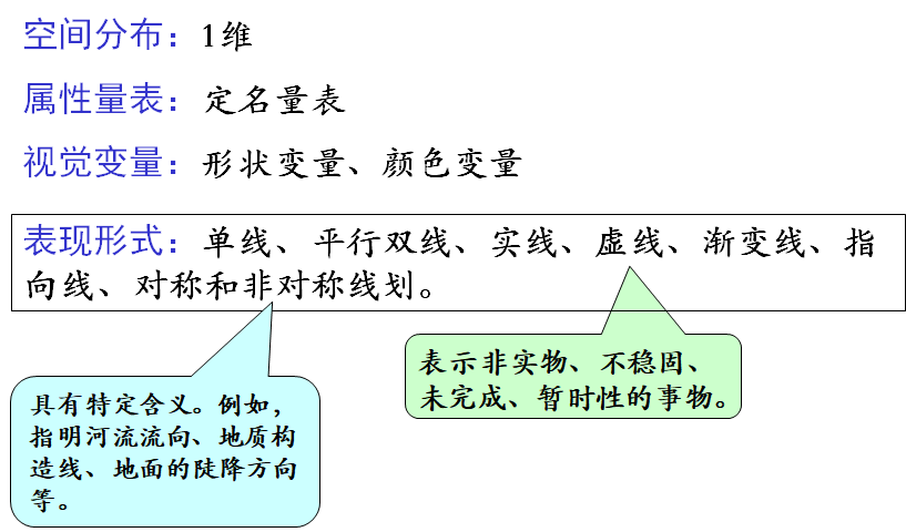 线状符号法——1维线状制图现象,通常以定名量表形状、颜色变量及其组合作为主要表示方法。
