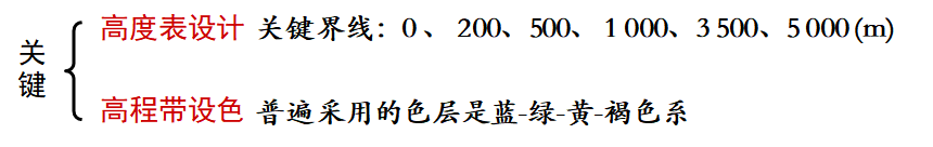 设色要求:每一色层准确地代表一个高程带;各色层之间要有差别,但不能过于突然和跳跃,以便反映地表形态的整体感和连续感。