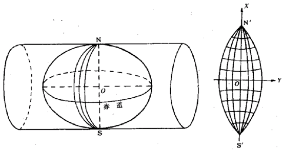 高斯——克吕格投影的原理:假设用一空心椭圆柱横套在地球椭球体上,使椭圆柱轴通过地心,椭圆柱面与椭球体面某一经线相切;然后,用解析法使地球椭球体面上经纬网保持角度相等的关系,并投影到椭圆柱面上,最后将椭圆柱面切开展平,就得到投影后的图形。