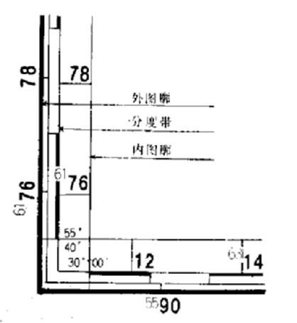 ◇在内外图廓间,还绘有黑白相间表示经差、纬差1′的分度带。 需要时将对应点相连接,就可构成很密的经纬网。
