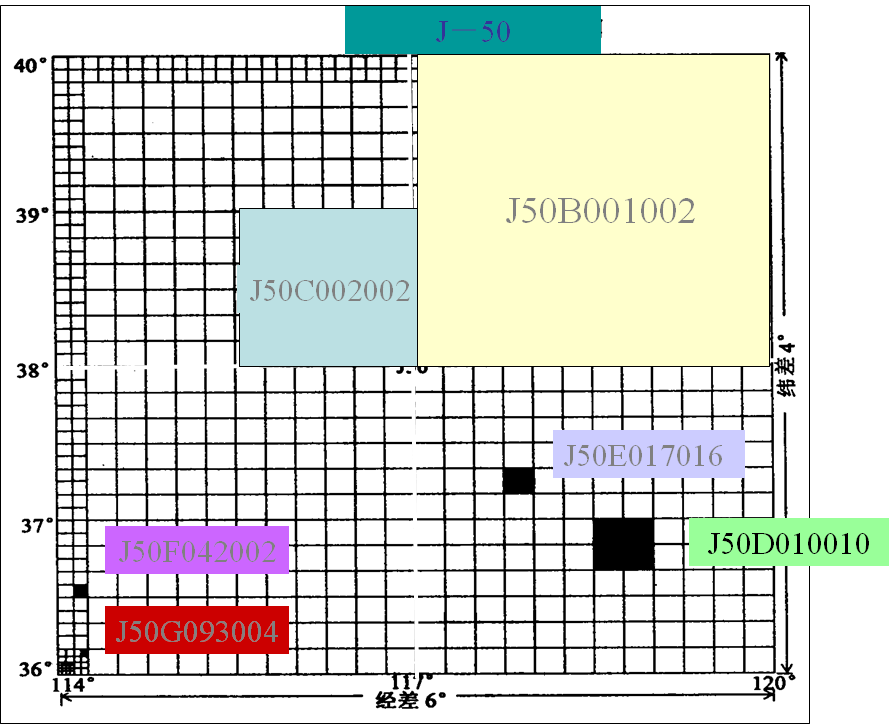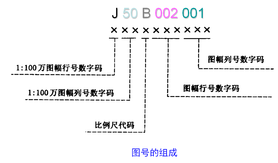 为了区分比例尺,在1:100万编号和该图行列式编号之间采用字母(由B,C,D,E,F,G,H组成)作为比例尺代码。