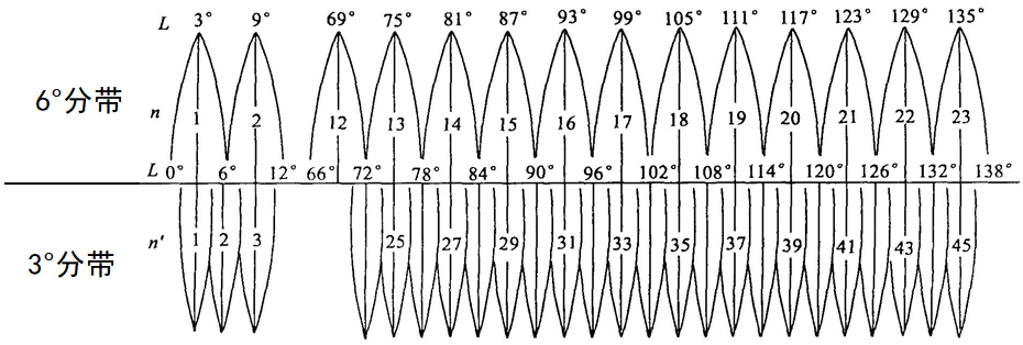 3°分带法:从东经1 ° 30´算起,自西向东按经差3°为一个投影带,全球共分120个带,我国位于24——45带。