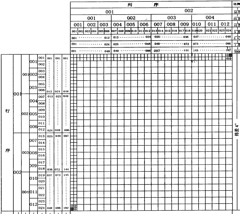 表示图幅的行、列代码均采用三位数字表示(不足三位时前面补0),取行号在前、列号在后的排列形式标记。