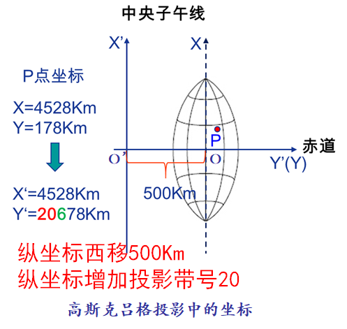 直角坐标网是以每一投影带的中央经线为纵轴(X轴),赤道作为横轴(Y轴)。纵坐标以赤道为0起算,赤道以北为正,以南为负。我国位于北半球,纵坐标都是正值。