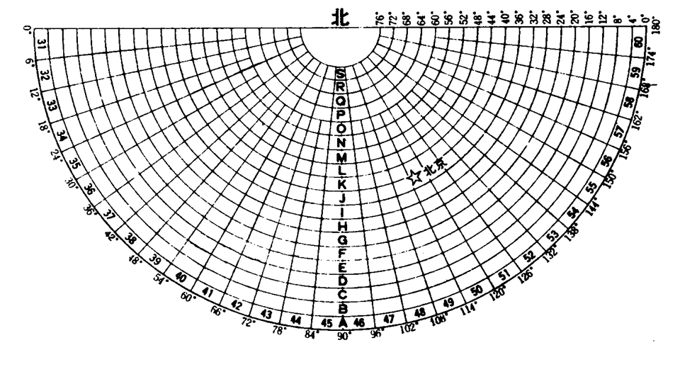 从赤道(0纬线)起,向两极纬差每4为一行,至南、北纬88各为22行,并依次以A、B、C、……V表示其相应的行号。