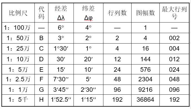 2. 不同比例尺按经、纬差划分图幅;