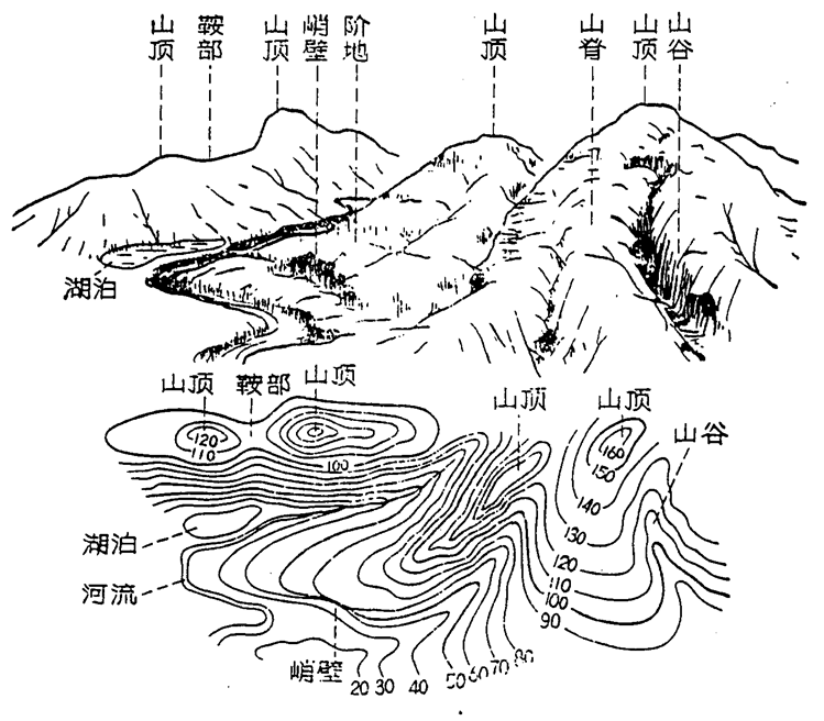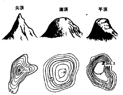 (1)山顶。是山的最高部分。山顶的等高线均是闭合形式。示坡线指向外侧。示坡线是垂直于等高线的短线,指示斜坡的方向。