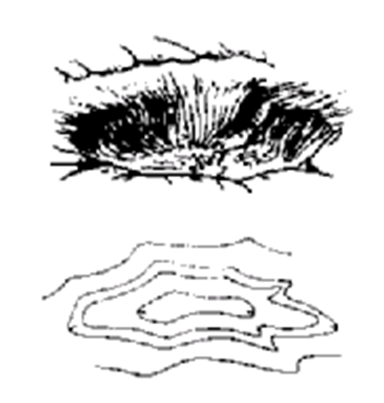 凹地等高线也是一组闭合曲线,外圈等高线高于内圈等高线值。在图上显示方法是示坡线绘在等高线的内侧。区别于山顶。