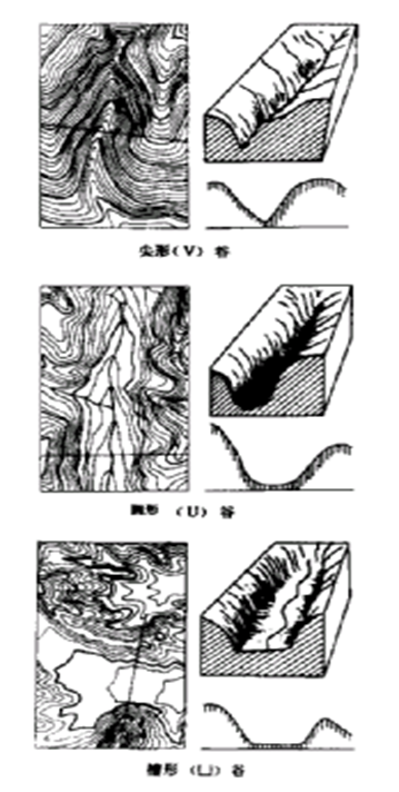 山谷按形状可分为尖形谷(V形)、圆形谷(U形)和槽形谷三种。